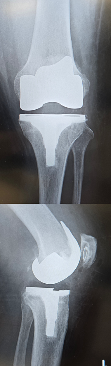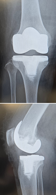 当院にて人工ひざ関節全置換術(TKA)を施行。両側の手術を同時に行いました。両側同時手術の場合でも入院期間は片側手術の場合と大きく変わらず(プラス1週間程度)、麻酔も1回で済むために身体的、経済的な負担の軽減を期待できます。また両ひざが同程度に悪いケースも少なくなく、同時に行うことで左右のバランスが良くなるためにリハビリをスムーズに進めることが可能となります。