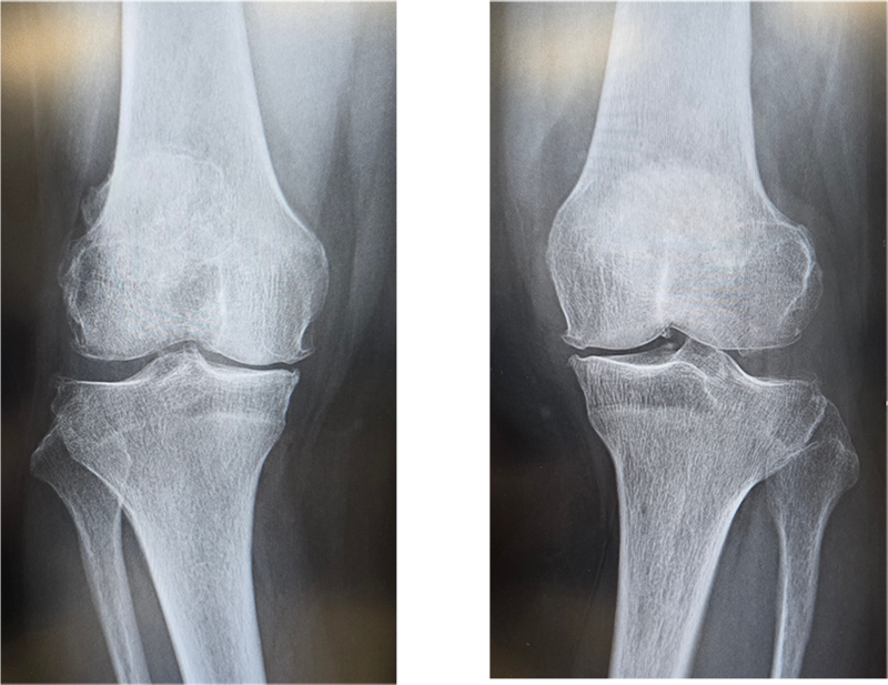 変形性膝関節症は一次性と原因疾患に続発する二次性に分類されます。わが国では年齢による退行性変化を主因とする一次性が多く、軟骨のすり減り、骨棘(骨のとげ)を伴い、多くは内反変形(O脚)を呈します。女性に多く、特に肥満との関連が強いといわれています。膝関節には歩行するだけで体重の3倍の力がかかるといわれており、病状の予防や進行を抑えるためには体重のコントロールが最も重要です。症状には波がありますが、次第に進行し、変形も悪化してきます。まずは保存加療を行いますが、痛みが強く日常生活に支障をきたすようだと、我慢するメリットはありません。痛みのない脚でより良い人生を送るために手術という選択肢もありますので、痛みで悩まれている場合は早めにご相談ください。