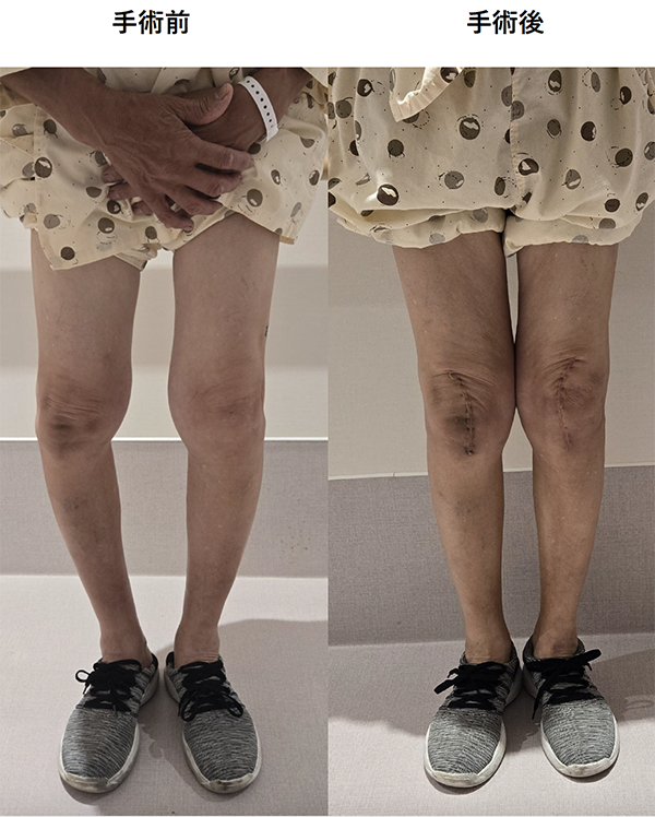 当院にて右人工膝関節全置換術(TKA)を施行。術前、歩行も困難でしたが、術後は杖歩行も安定し、良好な可動域も獲得。入院中に反対側の人工膝関節単顆置換術(UKA)も行い、十分なリハビリ後に退院となりました。